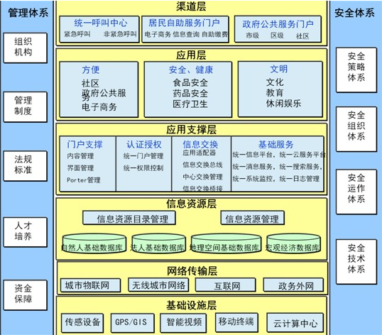 智慧民生總體架構(gòu)分為六大技術(shù)層面,兩大保障體系